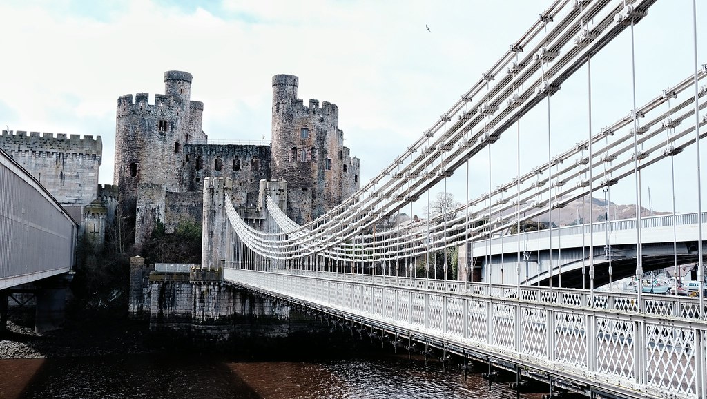 Lâu đài Conwy vẫn còn ẩm ướt dưới cơn mưa phùn. Từ lâu đài có thể nhìn ra biển và cả con đường tàu hỏa tiến vào thành cổ. Vì gần biển nên quanh lâu đài có rất nhiều chim hải âu, và cả đàn quạ đen nữa. Từ lâu đài có thể nhìn thấy cây cầu Conwy Suspension Bridge bắc qua sông Conwy. Cây cầu được xây dựng năm 1826, giúp tuyến đường London – Holyhead vượt qua sông Conwy dễ dàng hơn. Tuyến đường này rất quan trọng vào thế kỷ 19 vì nó nối London với cảng Holyhead, nơi tàu đi sang Ireland. Dù được xây dựng rất lâu sau đó, nhưng kiến trúc tòa tháp của cây cầu như cũng hòa vào kiến trúc Trung Cổ của lâu đài Conwy, khiến cho cả thị trấn Conwy mang một vẻ vừa uy nghi vừa lãng mạn. Ra khỏi lâu đài, tôi chạy ra chỗ câu cầu một lúc rồi về khách sạn nhận phòng. Nghỉ ngơi một lúc, tôi bắt chuyến xe bus 5A tới bán đảo Llandudno.